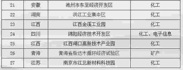 入围的化工园区有:上海化学工业区、四川什邡经济开发区、安庆市高新技术产业开发区、姚家港化工园、宜都高新技术产业园、祥云财富工业园、连云港徐圩新区、江西德安工业园、泰兴经济开发区、荆门化工循环产业园、江西新干工业园、贵州福泉经济开发区、池州市东至经济开发区、洪江工业集中区、江西金溪工业园、绵阳经济技术开发区、江西湖口高新技术产业园、南京市江北新材料科技园。